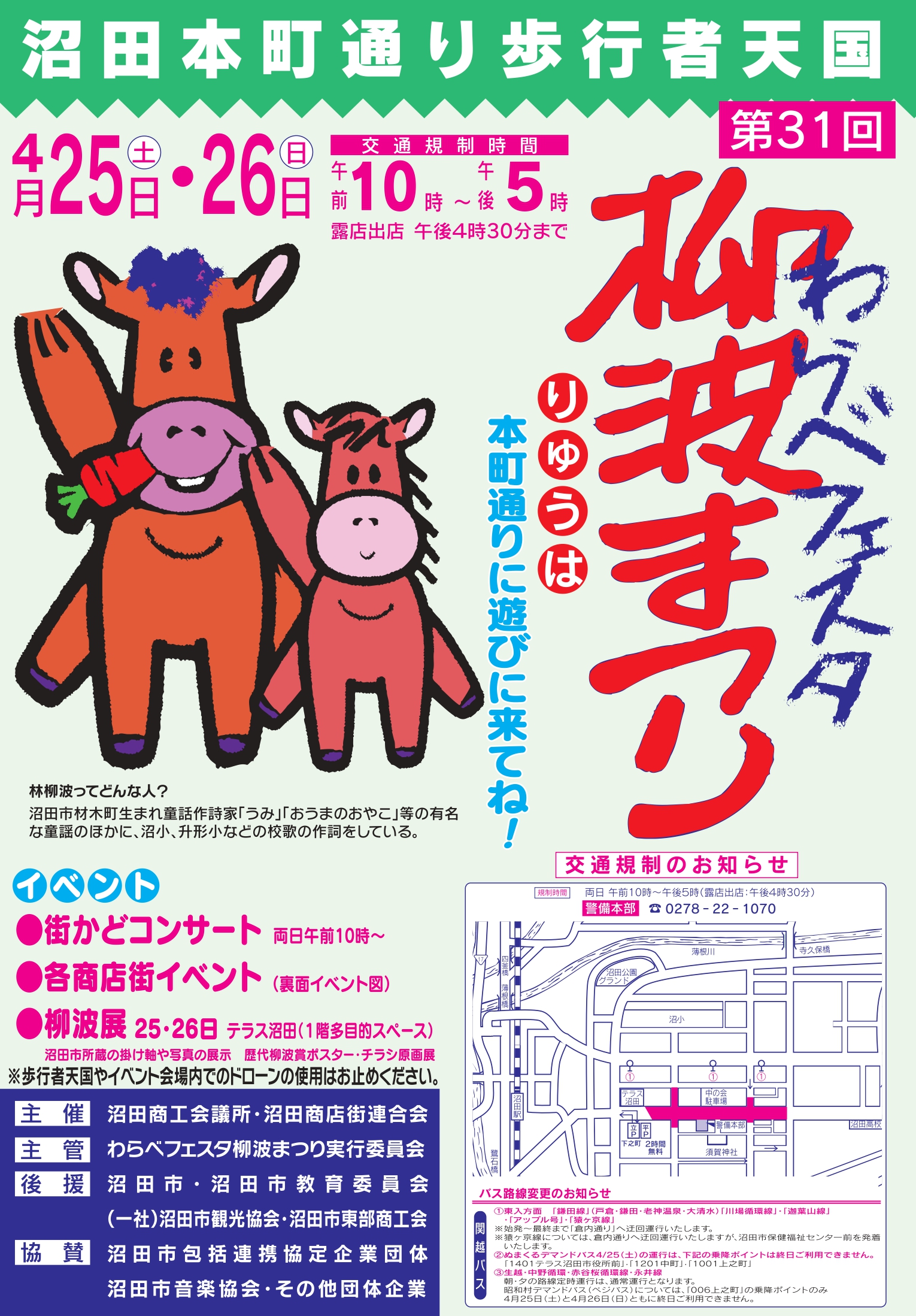 また、柳波まつり実施中は本町通りが歩行者天国となるため、以下のとおり交通規制を行います。