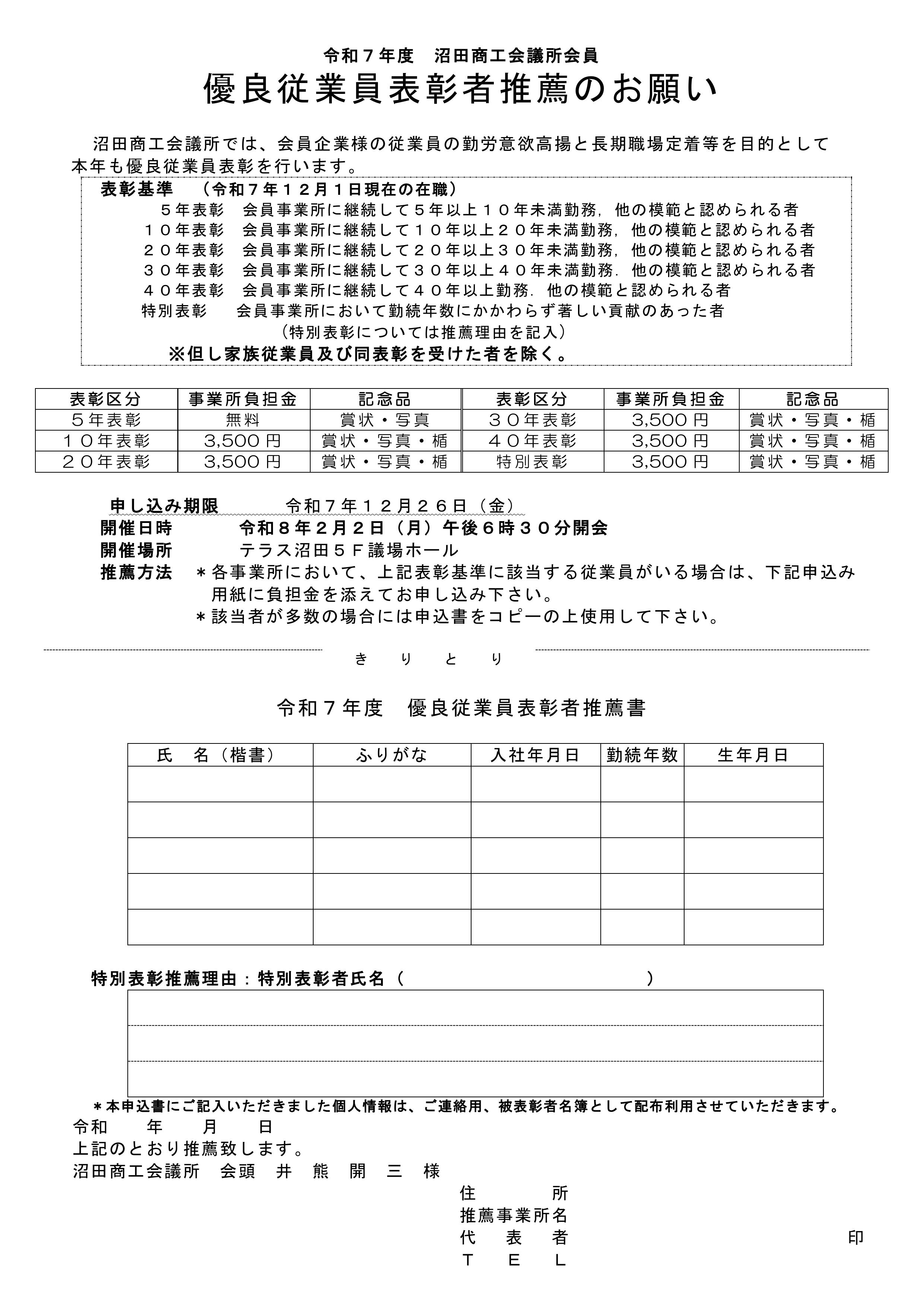 令和7年度沼田商工会議所会員優良従業員表彰について